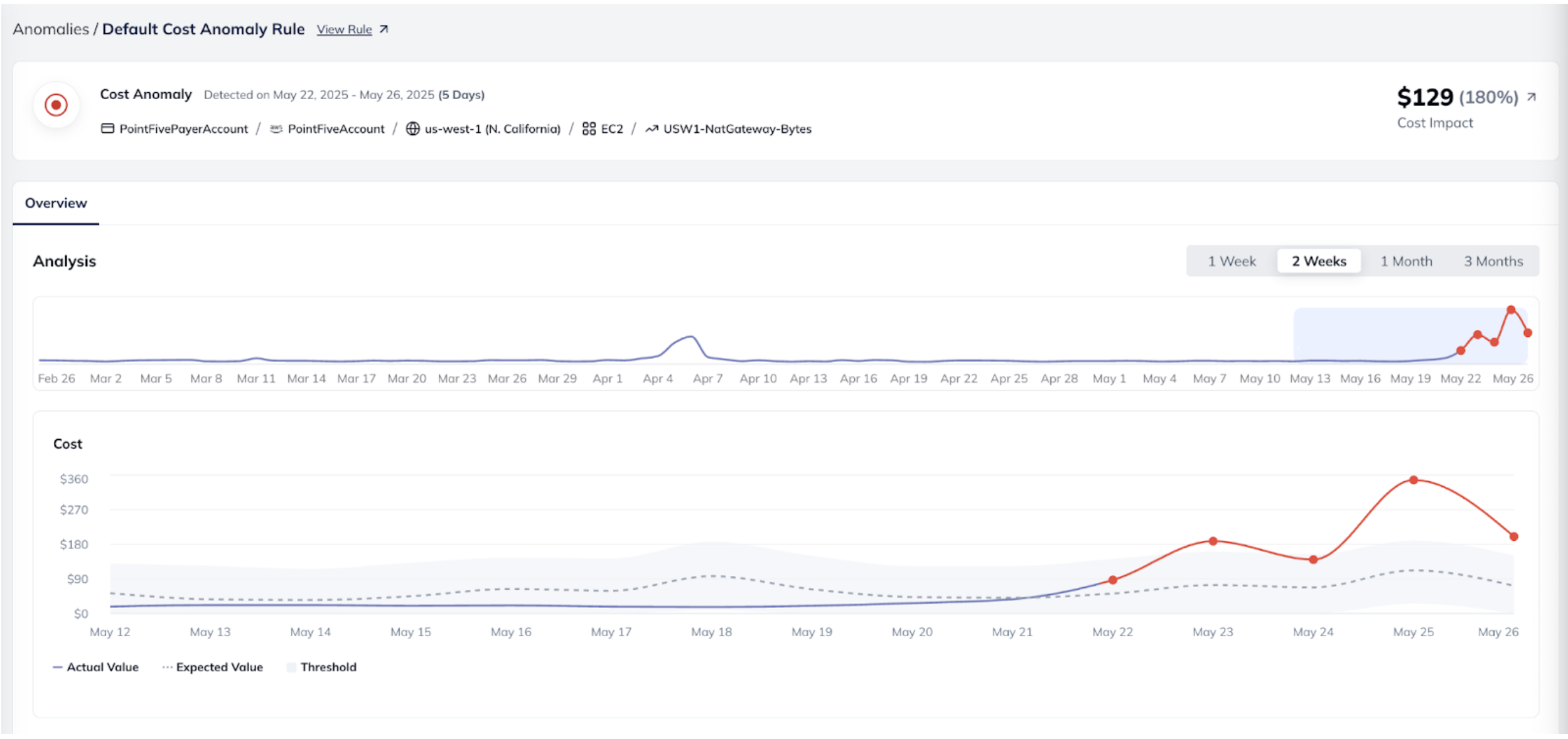 Usage and Rate Breakdowns help you quickly determine whether an anomaly was driven by a change in usage volume or in the effective cost per usage unit. A rate change might mean your price increased because a discount agreement expired or your pricing terms changed. This distinction matters because the root cause determines the right response. Without it, you risk fixing the wrong issue or missing the real source of unexpected costs.