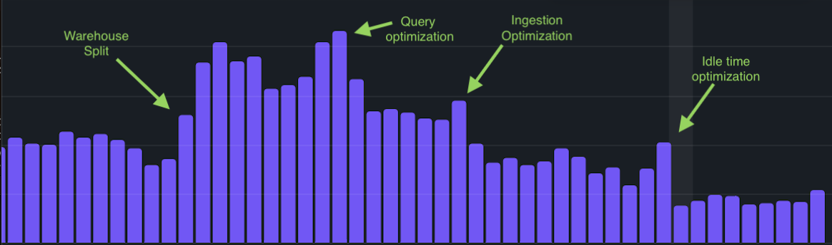 After implementing these changes, we expected costs to decrease slightly, as most queries were moved to smaller warehouses.