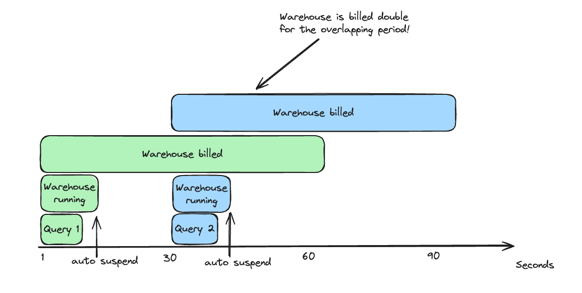 We took a deeper look at each of those disadvantages: warehouse startup took between 200-600ms in our testing, which wasn’t too bad, and there wasn’t a noticeable hit from the lost caching, at least in our case. As for the last point - to ensure we squeezed every buck from the minimum of 60 seconds bill, we bulked together enough queries to ensure they will take at least 60 seconds. So after all that, we decided to try reducing auto suspension to 1 second, meaning it would take 1-30 seconds to suspend the warehouse, depending on the Snowflake background process that shuts them down.