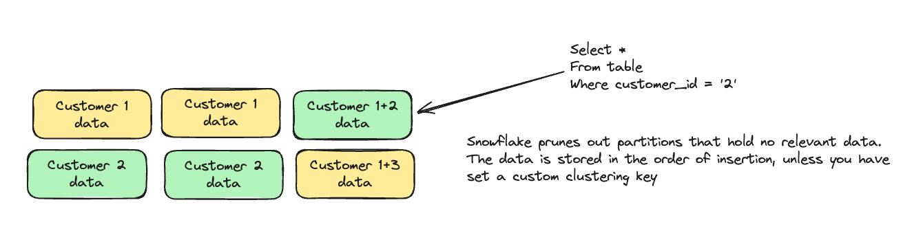 Snowflake doesn’t support indexing - instead, it’s up to the query to make sure you don’t go over too much data. If, for example, you copy data customer by customer, and you don’t specify a customer filter in your query - it might need to scan the entire table. Which is exactly what happened to us.We had some views with inner CTEs (See: https://docs.snowflake.com/en/user-guide/queries-cte), that didn’t have customer filter, which was only filtered down the road.Thus, those inner queries had to scan the entire table, only to filter out these values at a later stage. We had no way to filter out those inner values from outside, as it was a different customer for each query. So we replaced those views with UDFs (https://docs.snowflake.com/en/developer-guide/udf/udf-overview), that allowed us to pass the customer as a parameter to those inner CTEs. Each query now ran only on it’s relevant data. See the following example: